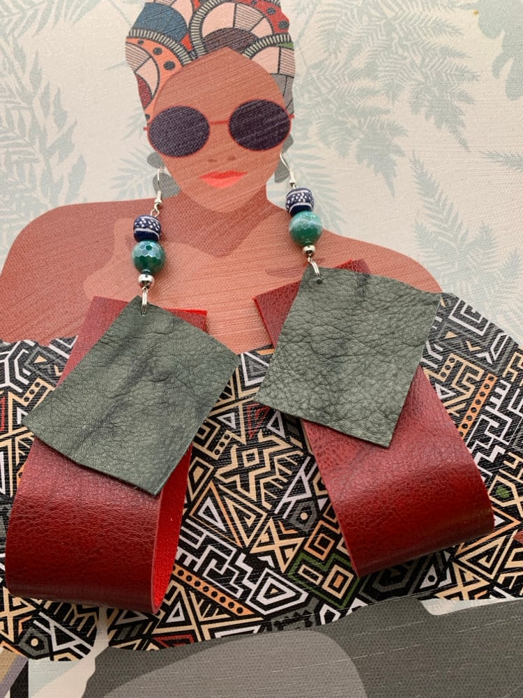 Large Cuff Earrings made with a soft ( green ) leather and a hard burgundy leather made with Jade and African beads no custom no return choking hazard