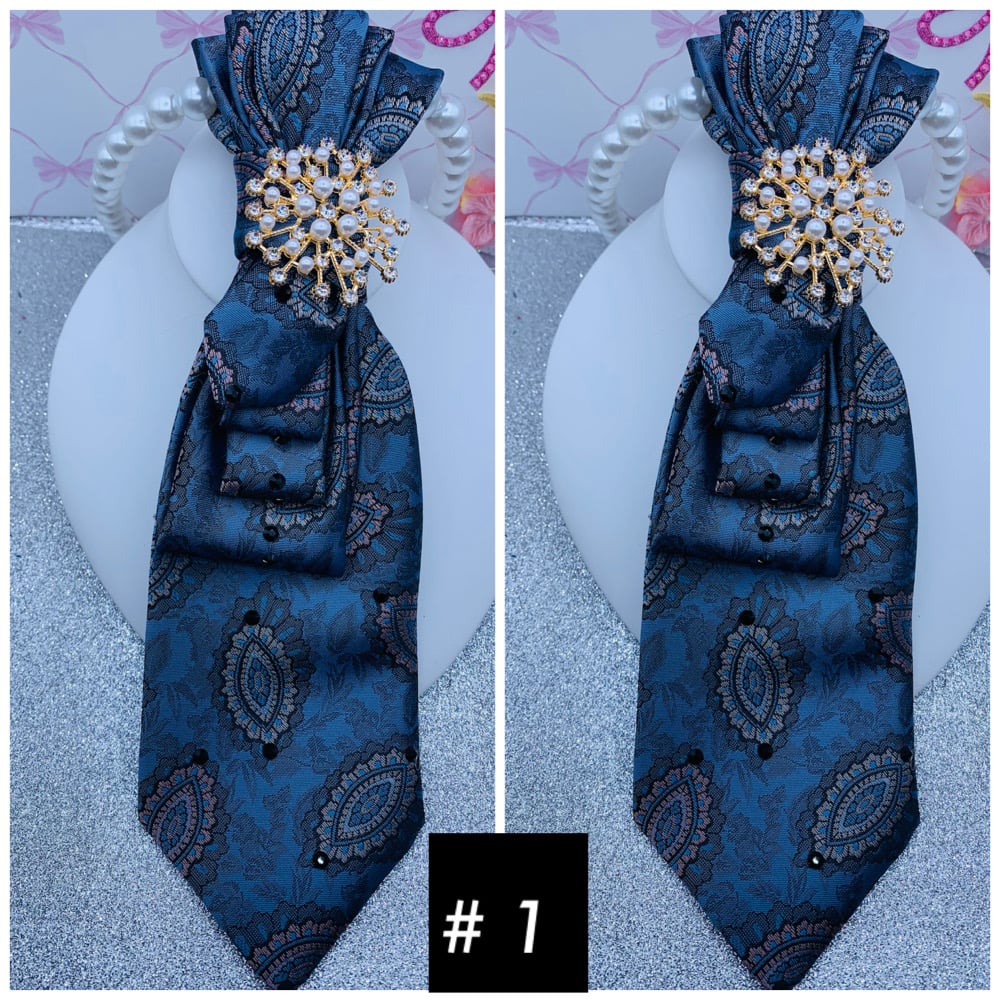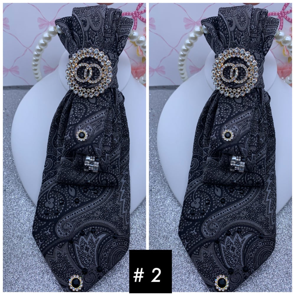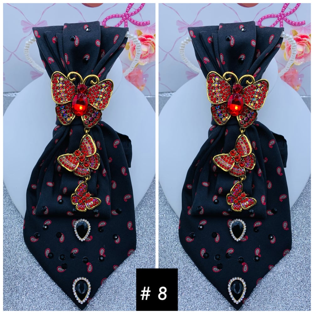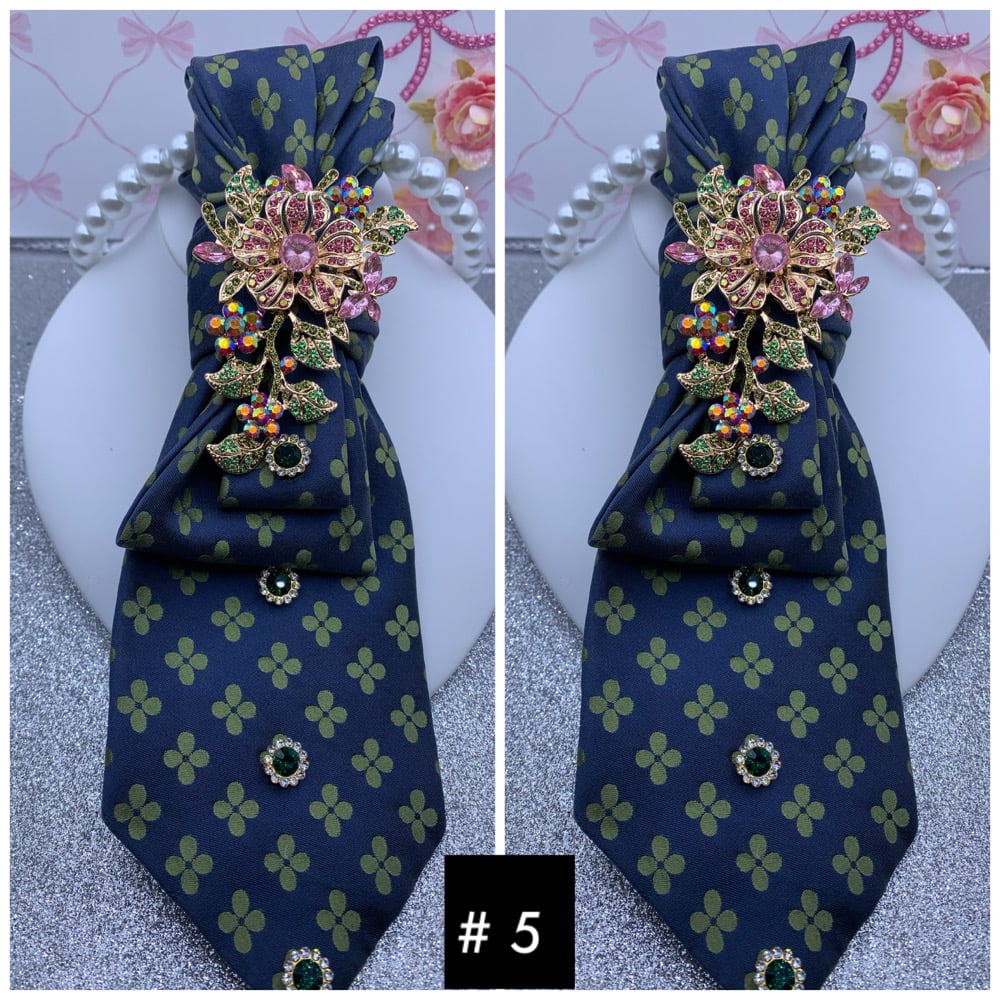 Make a beautiful statement with these one of a kind ties that come with brooches and a necklace